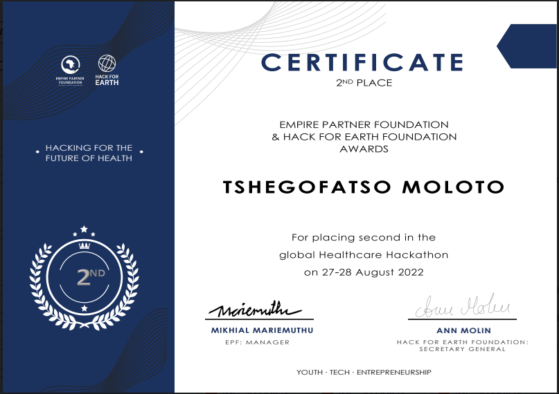 Empire Partner Foundation collaborated with Hack for Earth to host a global healthcare hackathon. The hackathon was hosted physically at the EPF HQ in Sandton and virtually on Discord, with multiple teams from 22 different countries. In my team, I played the role of UI/UX Designer, and my duty was to design the prototype of our solution, which was to be presented to the judges. With our solution presentation and prototype, we earned second place in the competition and made it into the incubation hub. Where we will get all the assistance we need to further develop our solution and deploy it to the market.